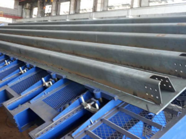 焊接摇晃反变形胎夹具主要由350x250的热轧H型钢焊接而成,背面设有转动油缸、油缸对中传动链、反变形压紧油缸和液压管路等。